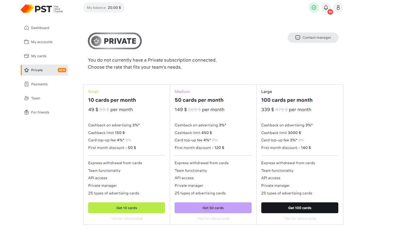 PSTNET’s Private program is the key to optimizing ROI. With three subscription tiers, users gain access to a package of cards, up to 100 of them monthly (with extensions available), along with a 3% cashback on advertising spending and down to 3% top-up discount. This program doesn’t just reduce costs; it offers a holistic solution for boosting ROI.
